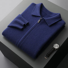 Premium cashmere knit with a structured collar and smooth zip front, paired with side pockets for polished warmth that transitions seamlessly.